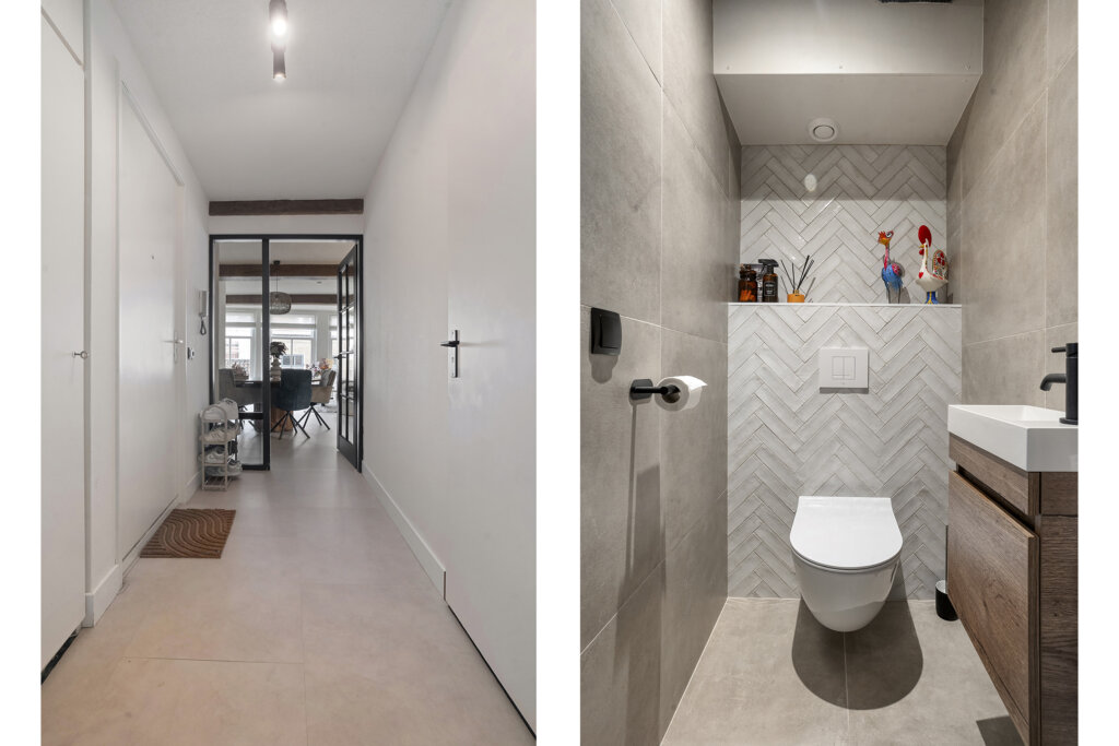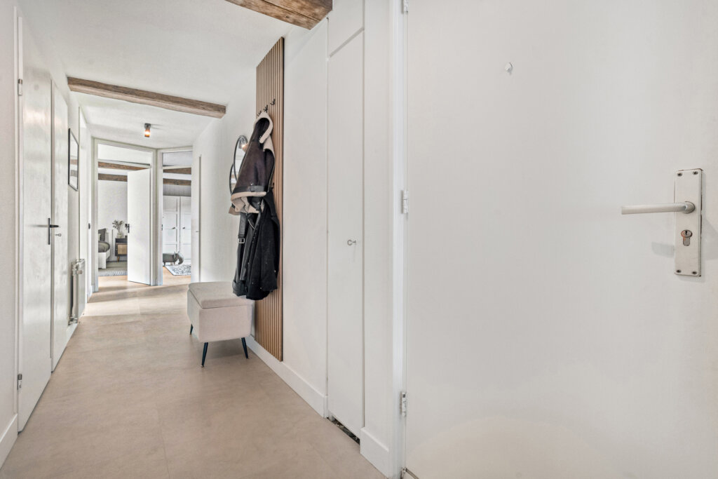 Aangekomen op de eerste verdieping vind je de voordeur van dit bijzonder sfeervolle appartement. Je stapt binnen in de ruime, lichte hal die direct de toon zet: rust, ruimte en een overzichtelijke indeling. Vanuit deze hal heb je toegang tot het toilet, de moderne badkamer, de CV-kast, de bijkeuken, een praktische provisiekast, beide slaapkamers en de woonkamer.
