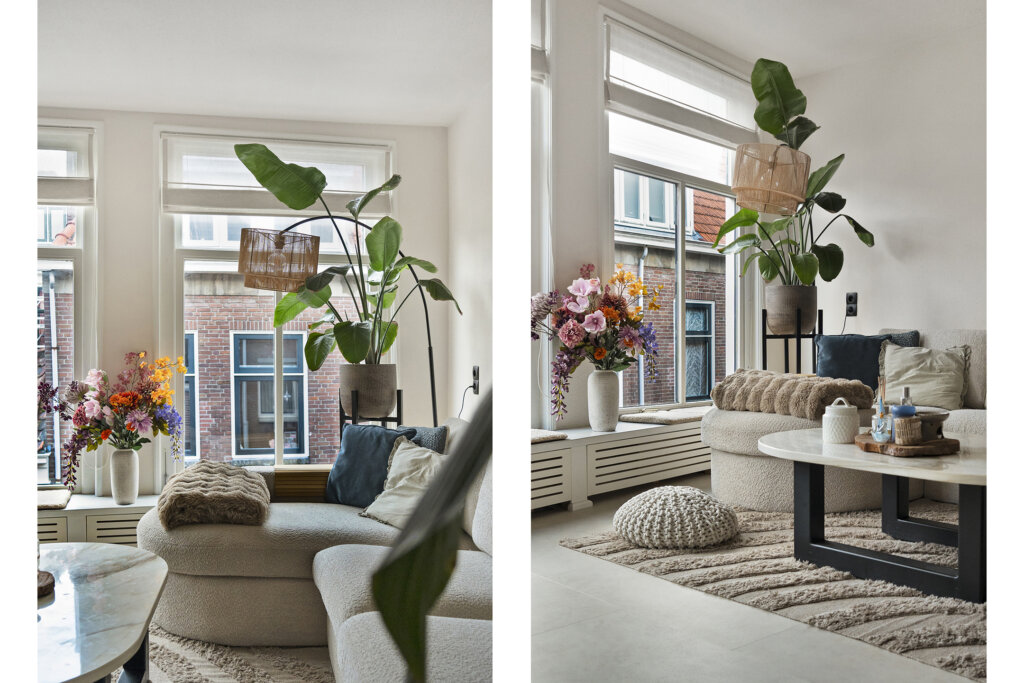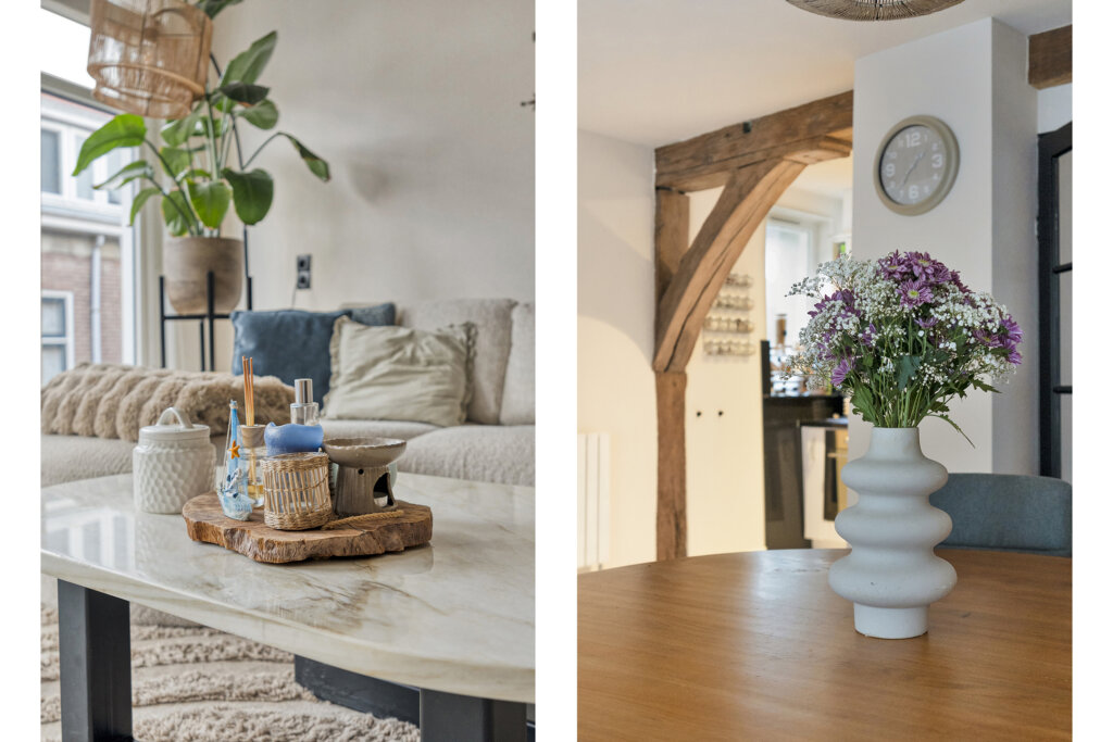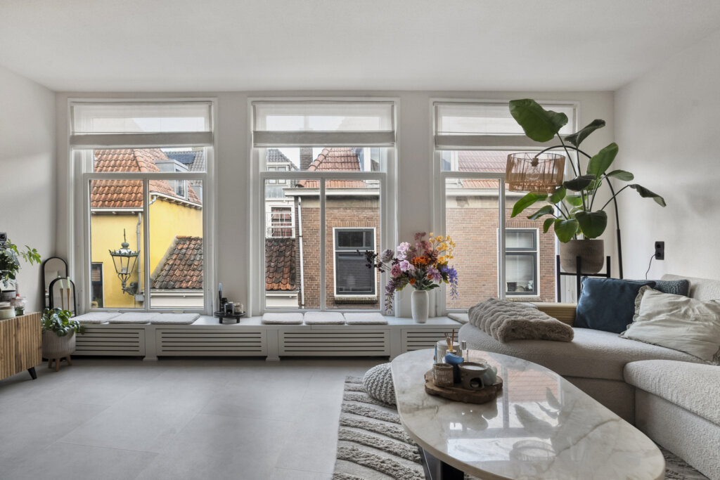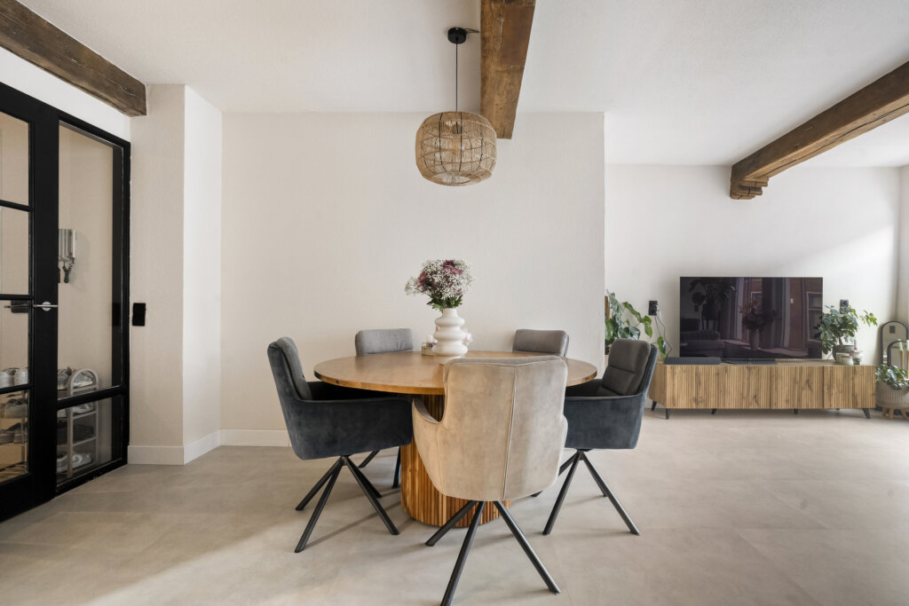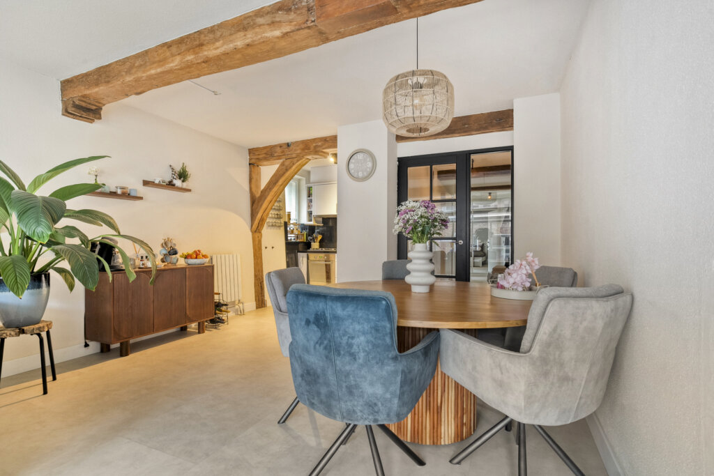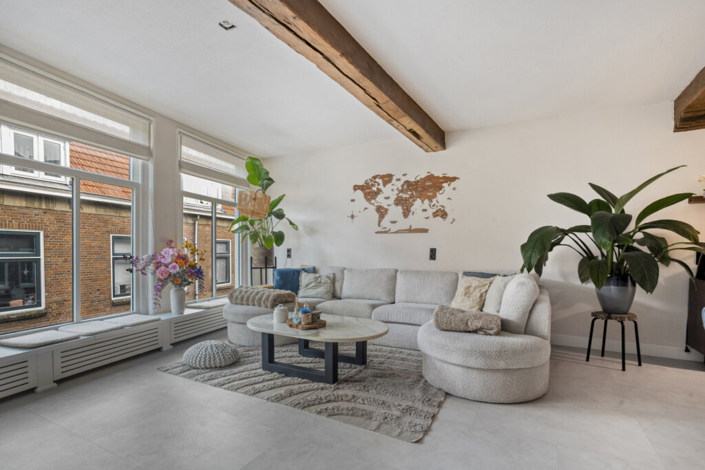 De woonkamer is een heerlijke, straatgerichte leefruimte waar het daglicht royaal binnenkomt dankzij de grote raampartijen. De prachtige houten balken aan het plafond geven de kamer een warme, karakteristieke uitstraling die direct opvalt en het geheel bijzonder maakt.