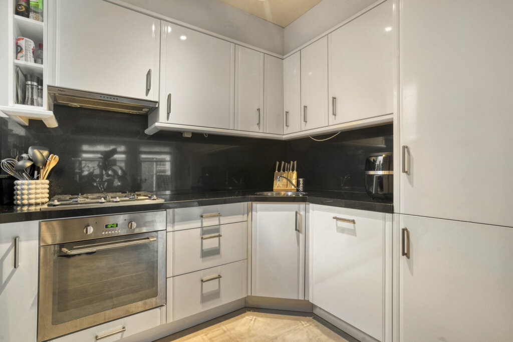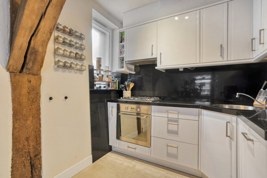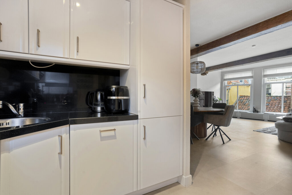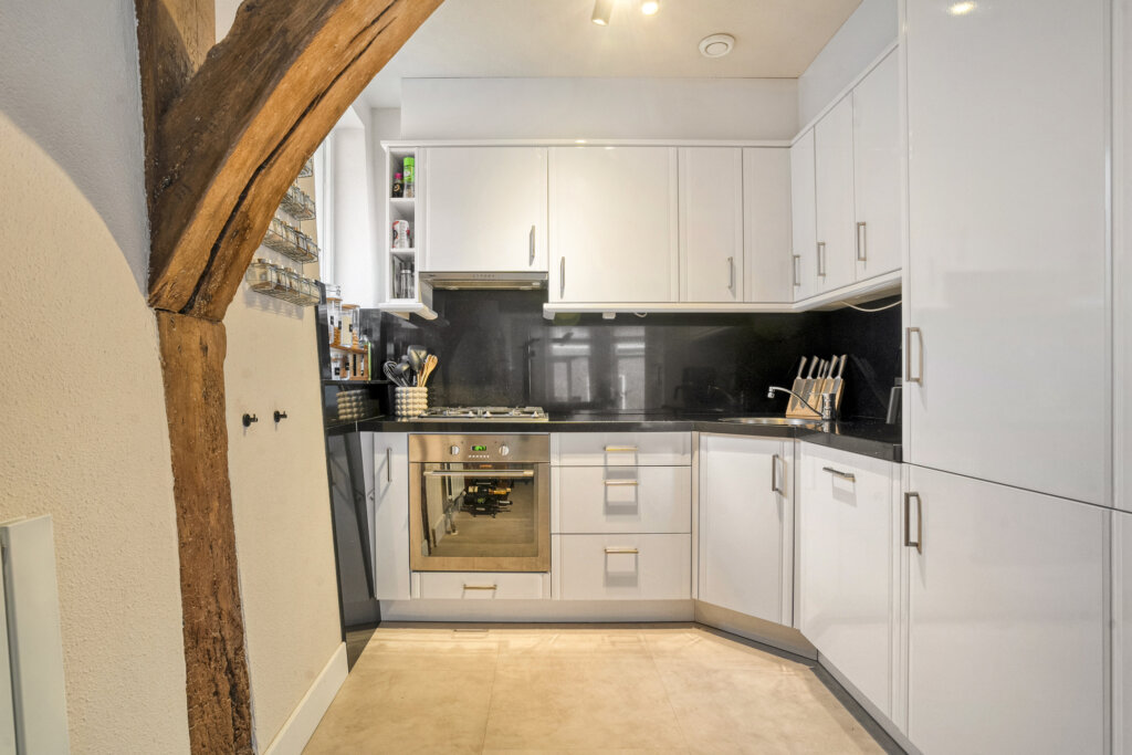 Aan de achterzijde van de woonkamer bevindt zich de open keuken. Deze praktische keuken is modern uitgevoerd met diverse inbouwapparatuur. Dankzij de open indeling vormt de keuken een geheel met de woonkamer, waardoor koken en gezellig samenzijn naadloos in elkaar overlopen.