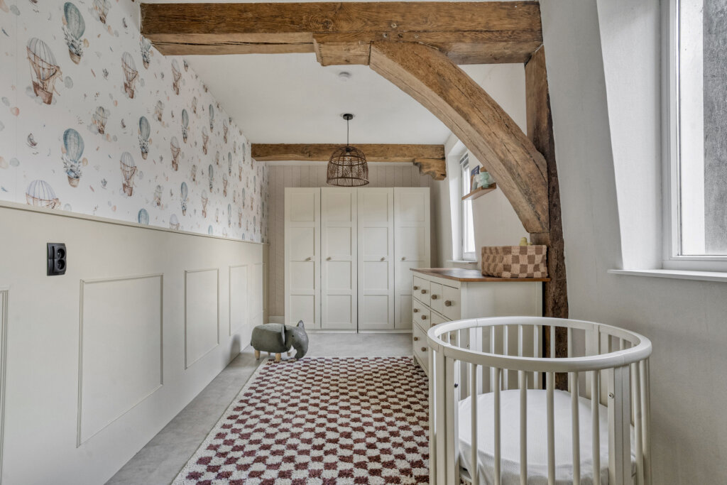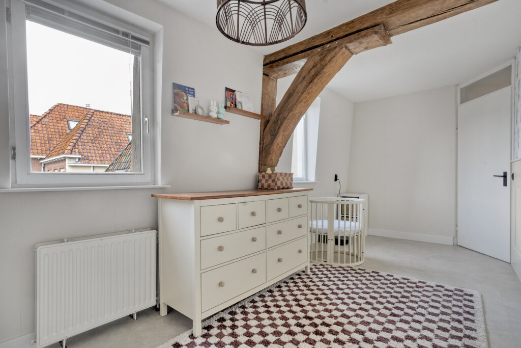 Aan de achterzijde van het appartement liggen de twee ruime slaapkamers. Beide kamers zijn voorzien van de kenmerkende houten balken aan het plafond, wat ook hier zorgt voor warmte en sfeer. De grootste slaapkamer biedt directe toegang tot het royale dakterras. De tweede slaapkamer is ideaal als kinder-, logeer- of werkkamer.