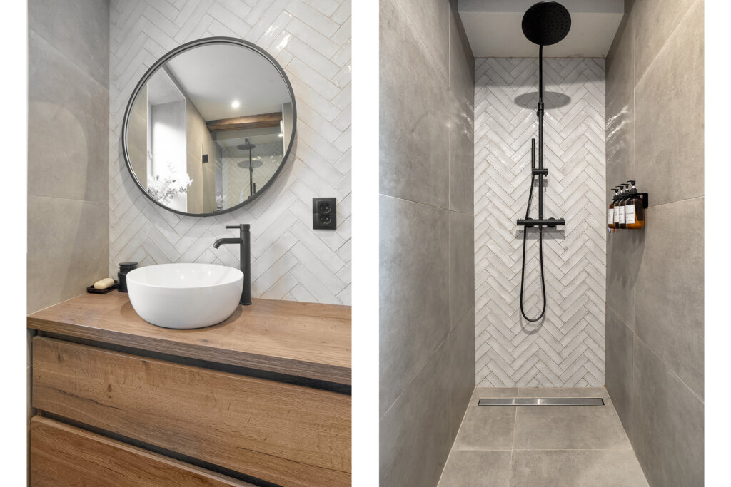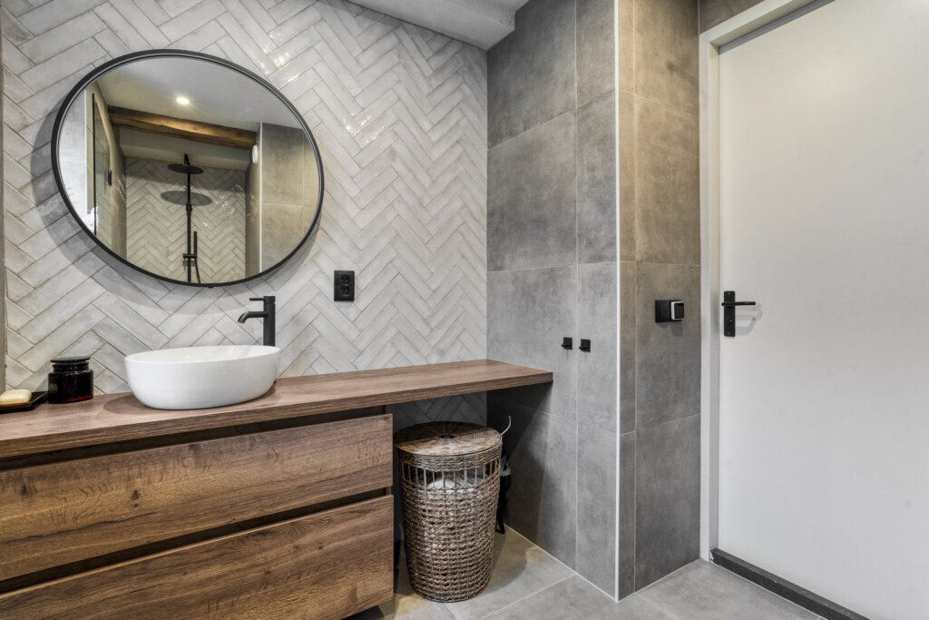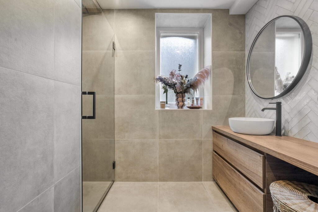 De badkamer is stijlvol ingericht, met grote tegels in zachte natuurtinten die een rustige en luxe sfeer creëren. De inloopdouche met zwart frame, het houten badkamermeubel en de ronde spiegel maken dit een ruimte waar comfort en design perfect samenkomen. Het aanwezige daglicht zorgt voor een extra frisse en lichte uitstraling.