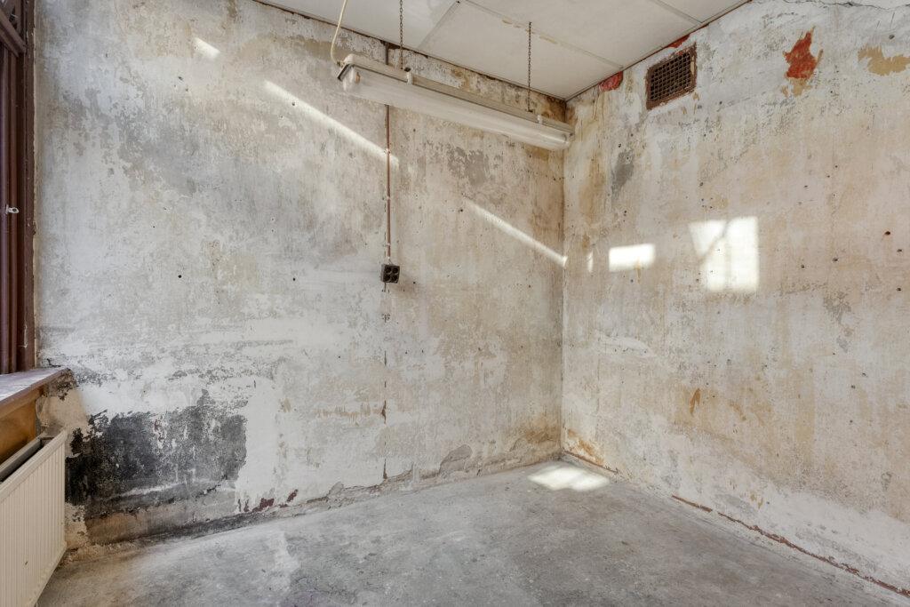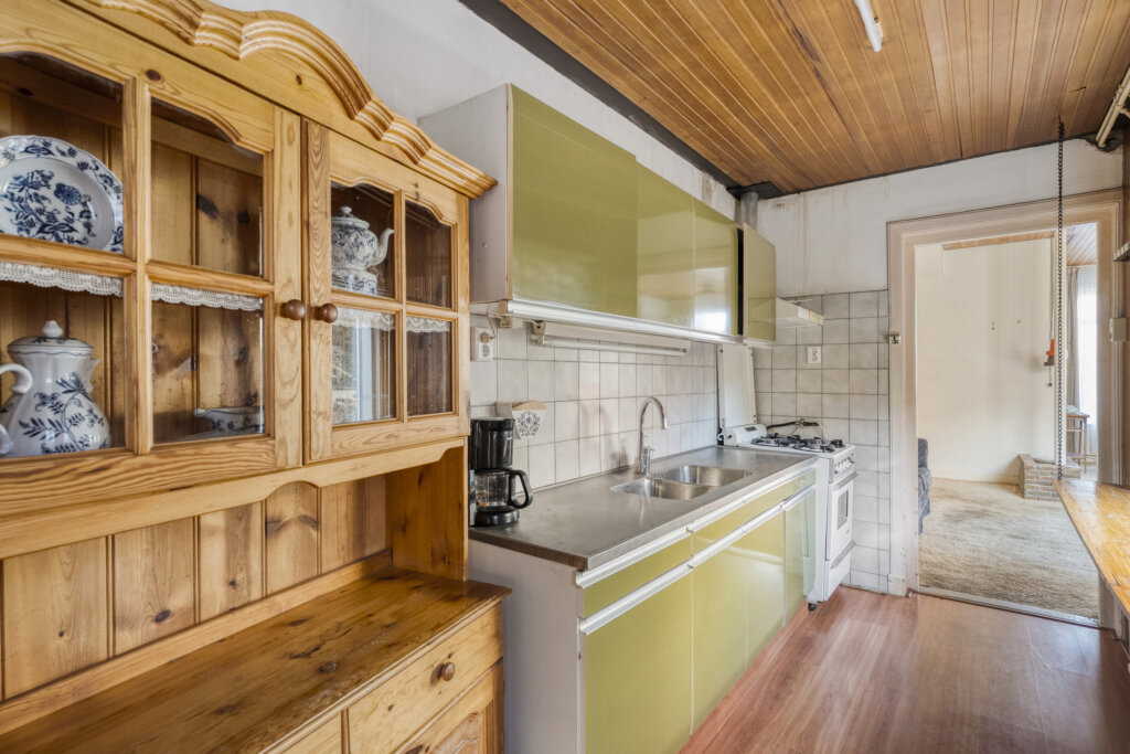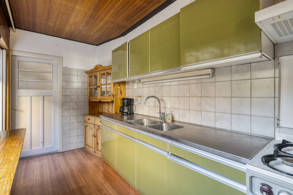 Vanuit de woonkamer loop je door naar de keuken. De keuken biedt veel licht dankzij de aanwezige raampartijen, beschikt over voldoende opbergruimte en is een praktische ruimte die uitnodigt om helemaal naar eigen wens in te richten. Via de keuken is er toegang tot de beschutte binnenplaats.