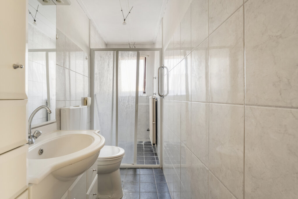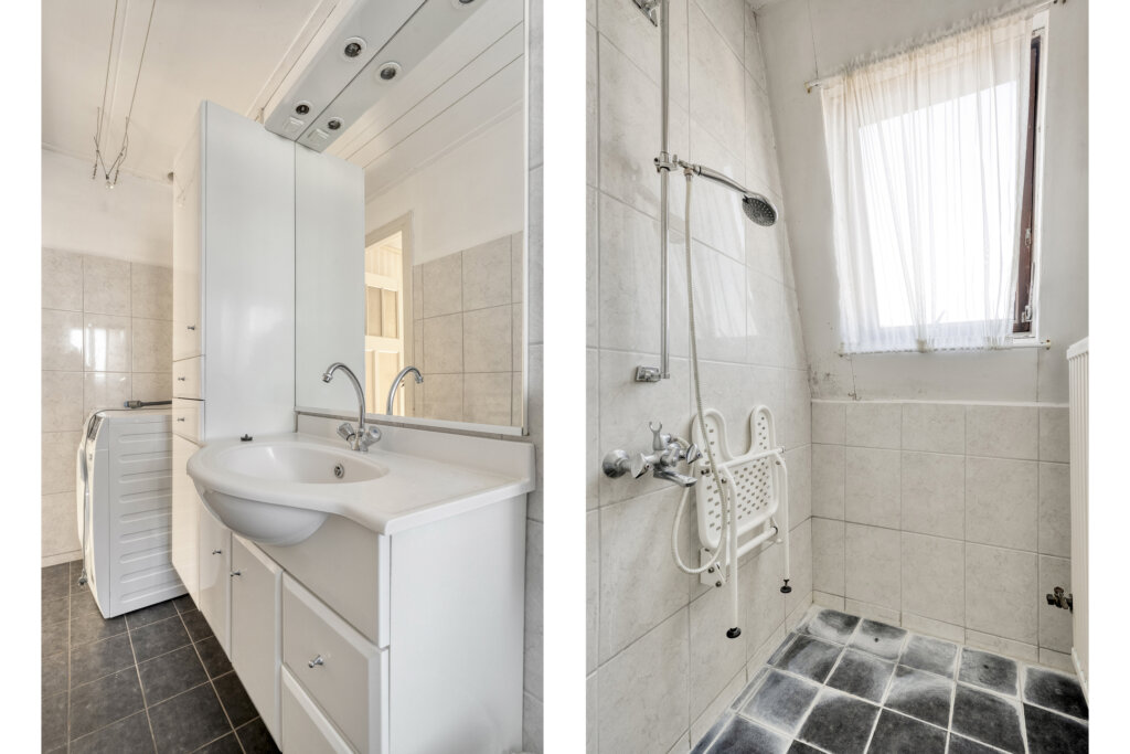 De badkamer is voorzien van een wastafelmeubel, toilet en douchecabine. Ook is hier de aansluiting voor de wasmachine aanwezig.