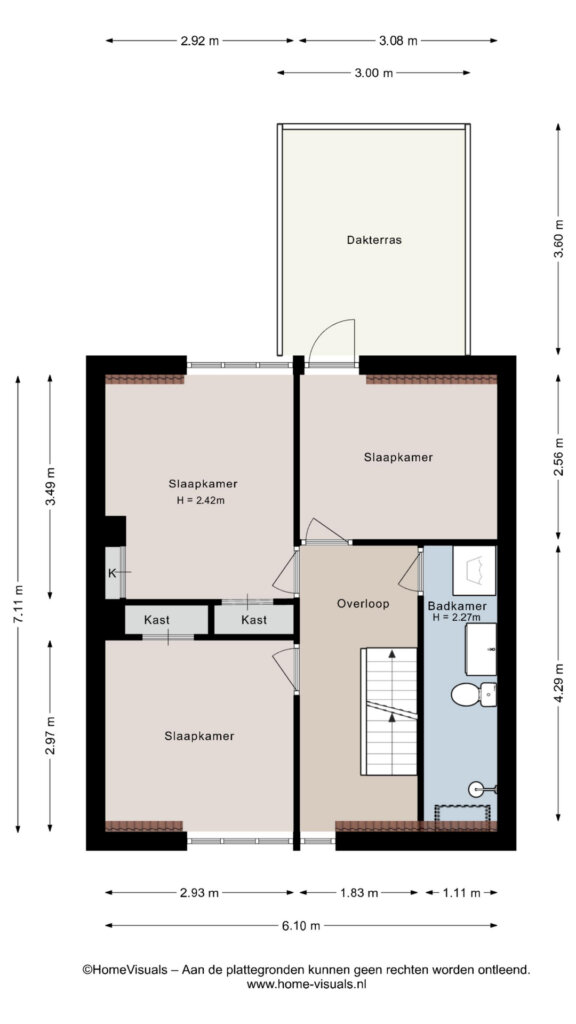 Op de eerste verdieping bevinden zich drie slaapkamers. De kamers zijn prettig van formaat en beschikken over meerdere inbouwkasten, wat zorgt voor praktische bergruimte. De derde kamer aan de achterzijde biedt toegang tot het dakterras, dat praktisch is voor bijvoorbeeld het drogen van de was.